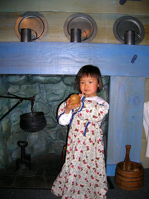 We found a dress that only needed the sleeves turned up a couple of times so Gwen could join us in costume in the frontier kitchen.